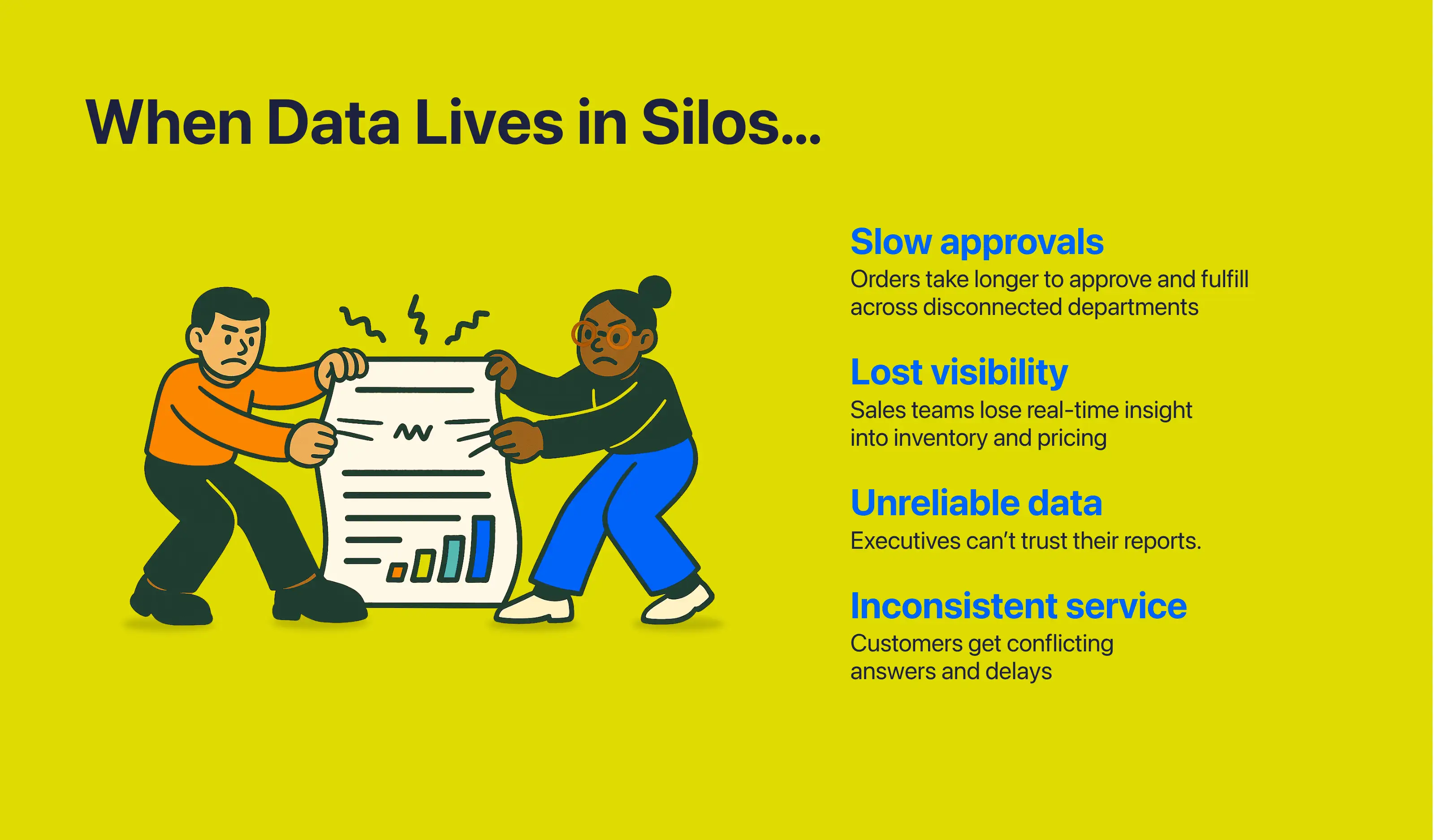 Each manual export and “temporary fix” compounds the problem. By the time it shows up as inconsistent pricing, delayed orders, or inaccurate reports, the damage is already done.