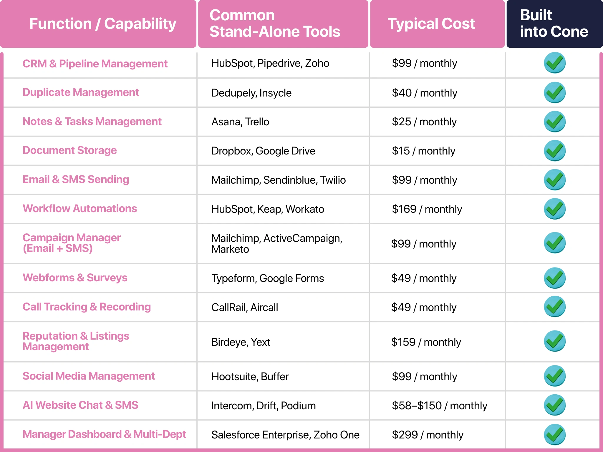 Absolutely. Cone is modular. Start with CRM + automation, then phase in reputation, calling, social, or dashboards.
